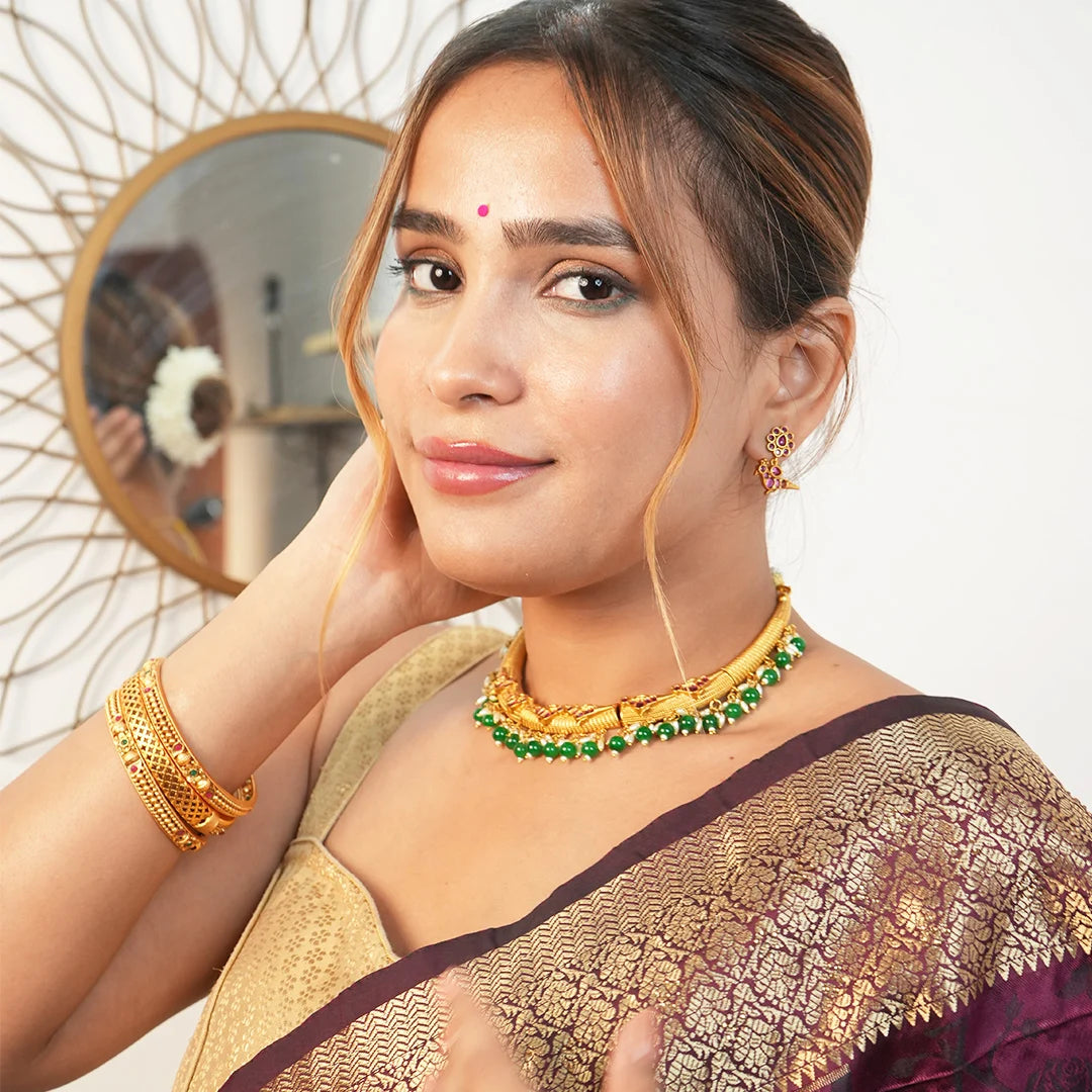 Add classic elegance to your collection with the Antique Gold Necklace with Emerald and Rice Pearl Hanging. Designed with intricate antique gold detailing, this necklace is enhanced by rich emerald accents and delicate rice pearl hangings that bring movement and charm to the piece. Perfect for weddings, festive occasions, and cultural events, it’s a graceful accessory that pairs beautifully with traditional and contemporary attire.