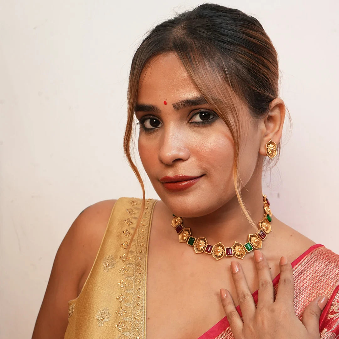 Celebrate timeless artistry with the Antique Padma Necklace with Ruby & Emerald Stone, a design inspired by the elegance of lotus motifs. Crafted with intricate antique gold detailing, this necklace is accented with vibrant ruby and emerald stones for a rich, regal look. Perfect for weddings, festive occasions, and cultural celebrations, it’s a standout piece that brings both tradition and sophistication to your ensemble.