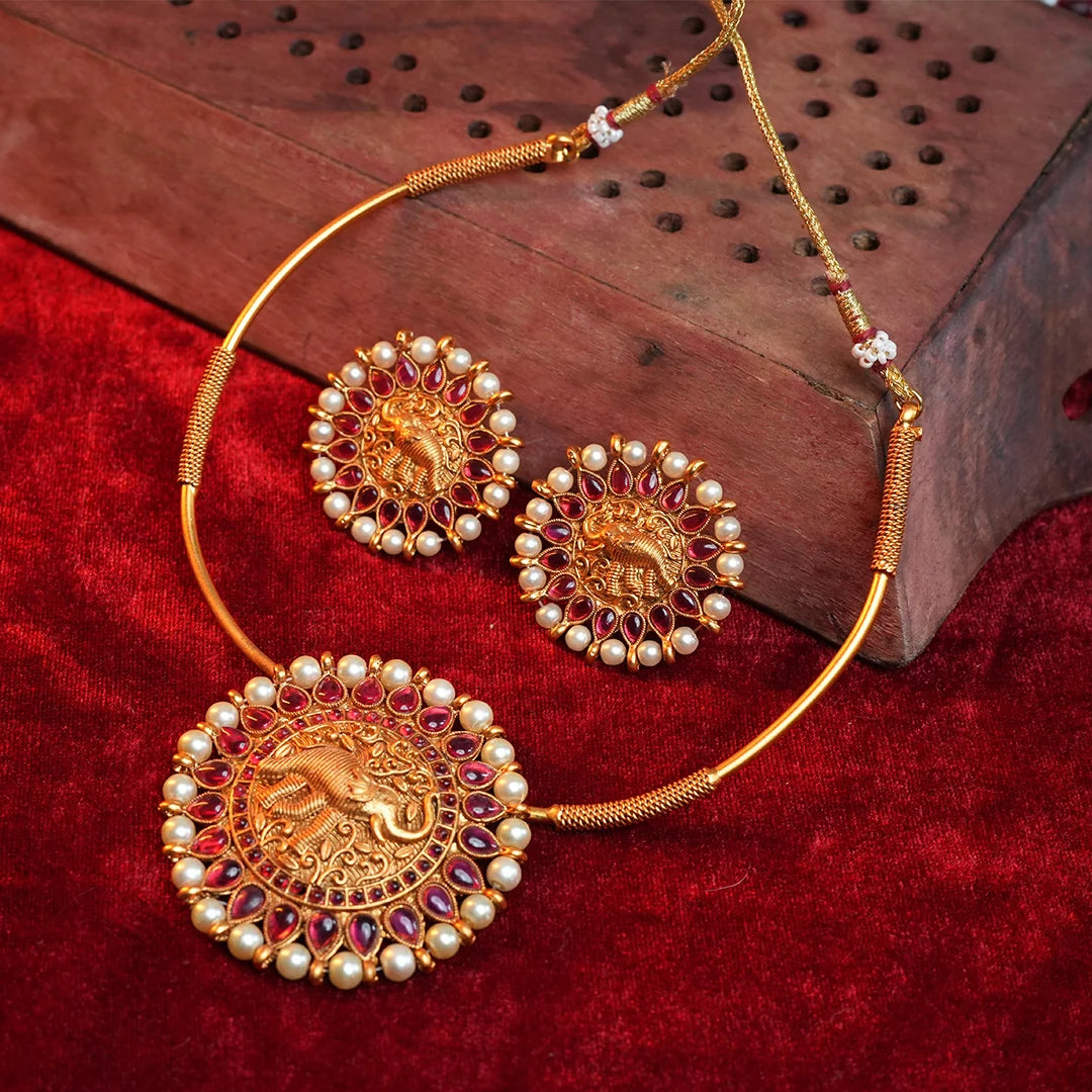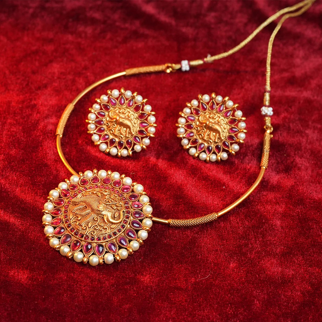 Crafted with premium materials and protected with an antique-gold plating, this set is designed to retain its shine and beauty over time. Lightweight yet luxurious, it blends comfort with sophistication, making it an essential addition to your jewellery collection.