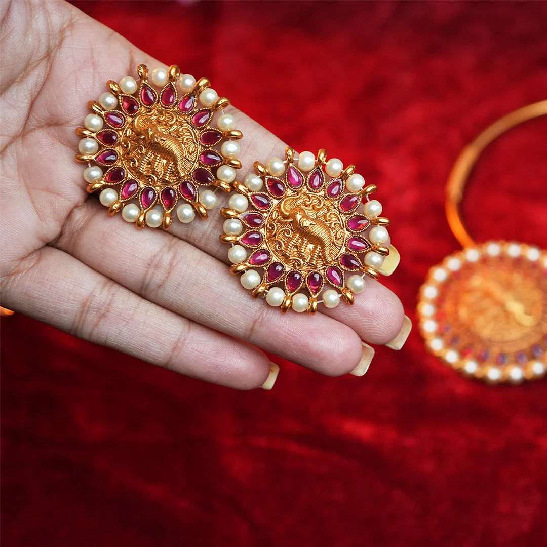 Bring home a piece of regal charm with the Gajraaj Hasli with Big Studs, a bold and elegant design inspired by heritage jewellery. The hasli-style necklace, crafted in an antique gold finish, features intricate detailing and royal motifs that reflect timeless artistry. Paired with statement big studs, this set is perfect for weddings, festive occasions, or any celebration where you want to make an impact.